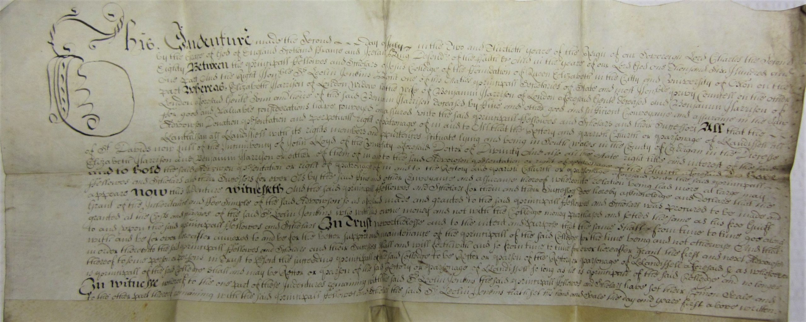 The original Indenture (see below) of 2nd July 1680 still exists in the College archive and details the transfer of the patronage of Llandysul to the College for the benefit of its Principal, Fellows and Scholars. Indeed, from then onwards most of the sitting Principals of Jesus College also became the Rector of Llandysul. This continued until the Welsh Church Act ultimately brought the patronage to an end, after 264 years, with Principal Alfred Ernest William Hazel ending his tenure as the final Jesus-appointed Rector of Llandysul in 1944.