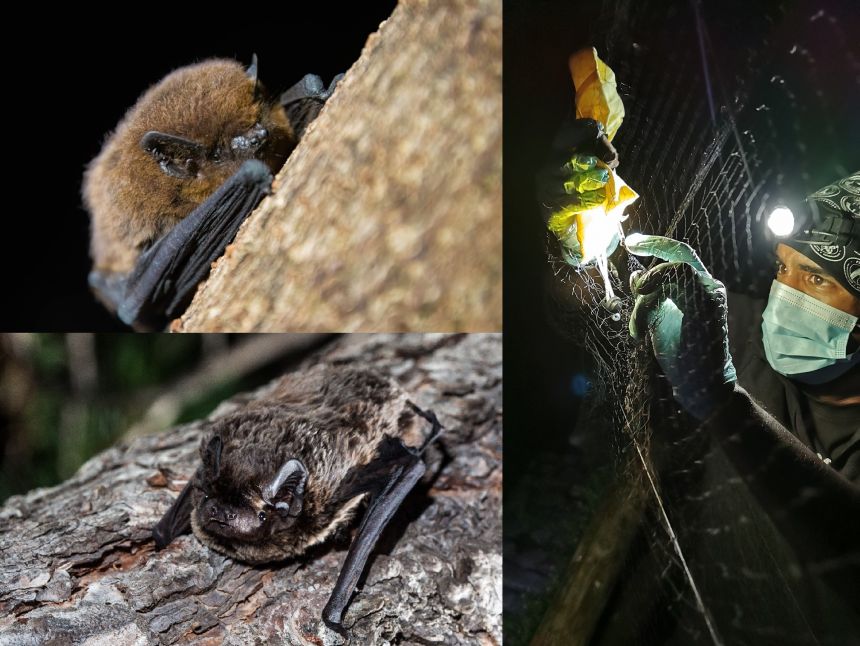 Clockwise from top left: Madeira pipistrelle (Pipistrellus maderensis) by Eva Nobrega. Ricardo Rocha conducting field work, credit: Ricardo Rocha. Lesser noctule (Nyctalus leisleri) bat by Adrià Lopez-Baucells.